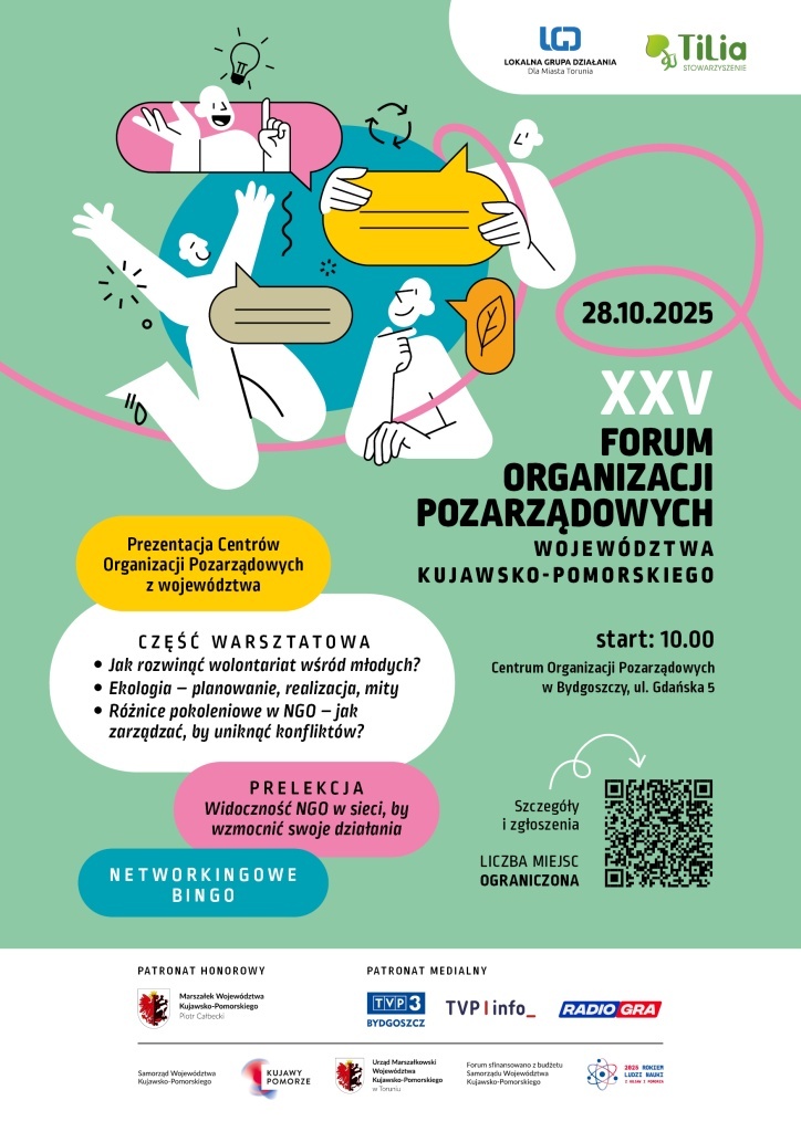 Zapraszamy na XXV Forum Organizacji Pozarządowych Województwa Kujawsko-Pomorskiego, które odbędzie się w Bydgoszczy 28 października 2025 roku. To prestiżowe wydarzenie, organizowane jest na zlecenie Samorządu Województwa Kujawsko-Pomorskiego przez Stowarzyszenie "Tilia" oraz LGD "Dla Miasta Torunia", ma na celu wzmocnienie współpracy samorządu województwa z trzecim sektorem oraz integrację środowiska.